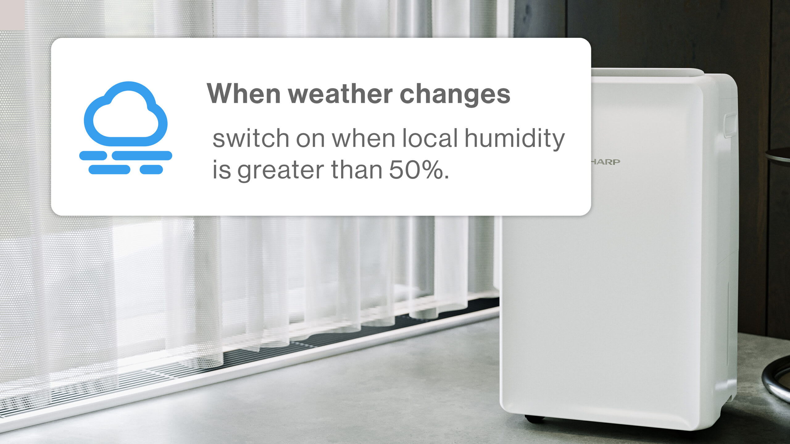 Quer que o candeeiro se ligue quando o sol se põe? Ou talvez queira que a ventoinha se ligue quando a temperatura exterior atinge um determinado nível. Agora pode programar isto com a aplicação Sharp Life.